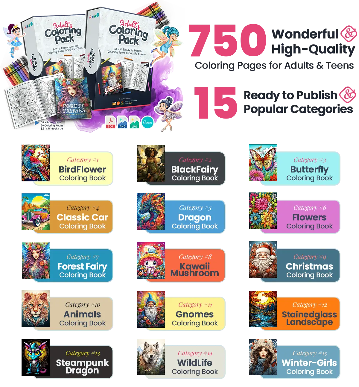 🔥 750+ DFY Coloring Pages for Adult & Teens, provided in 4 file types